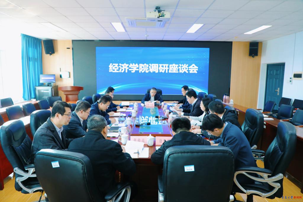 思政课授课前,胡金焱调研了学院工作,并与经济学院新老领导班子座谈交流。在听取学院工作汇报后,胡金焱对学院近年来取得的成绩给予了充分肯定,对以刘喜华同志为代表的上一届班子做出的突出贡献表达敬意和感谢,并对学院新领导班子寄予殷切希望。胡金焱指出,经济学院班子团结、凝聚力强、执行力好,人才队伍好、学科基础好、事业发展定位好,新的领导班子成员年轻化、专业化、有活力,要继续发挥好的传统,加紧布局如金融学、统计学等有潜力的专业学位博士点建设,持续推动学院办学实力提升。胡金焱要求,新班子在推动学院发展中还要抓紧补短板,一是要抓高水平学术学科平台建设,二是要抓高层次人才引育工作,三是要抓高水平学术成果产出,四是要抓服务社会能力提升。胡金焱强调,希望学院在下一步的工作中,继续发扬昂扬向上的精神,集中力量补短板扬优势,把每项工作做实做细,为实现学校事业高质量发展再立新功。